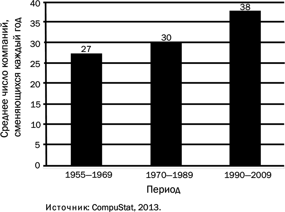 Внимательный взгляд на неопределенность запроса среди Fortune 500 (список крупнейших промышленных компаний США) подтверждает эту схему. Движения внутри компаний высшего эшелона значительно ускорились между 1950 и 2010 годами (рисунок 1-2): в 1960-е попадали в список Fortune 500 и покидали его 27 компаний в год, но в настоящее время это число выросло до 37 – рост почти в 50 %. Это означает, что фирма в среднем остается в Fortune 500 в течение семи лет вместо 12 в недалеком прошлом. Другие академические исследования подтверждают, что выдерживать конкурентное преимущество в среде высоко- и низкотехнологичной промышленности становится все труднее{17}.
