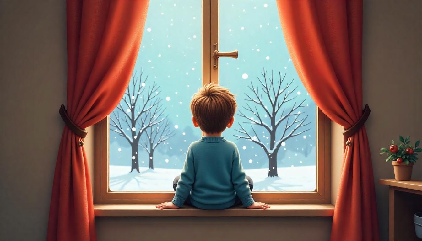 Амир сидел на подоконнике и задумчиво смотрел в окно. За стеклом падали крупные хлопья снега, укрывая всё вокруг белым пушистым одеялом. Его старшая сестра Сафия устроилась рядом с книжкой, время от времени поглядывая на притихшего брата.