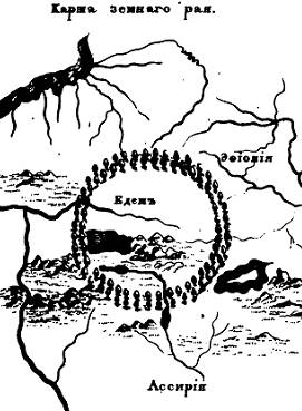 «Эдем – …см. также Рай. – По Ветхому Завету (см.: Бытие. 2, 8 – 3, 24), место на земле, где был земной Рай (парадиз) и откуда шел поток, затем разделявшийся на четыре реки (Тигру Евфрат, Геон, Фисон). Эдем и Рай локализовались неопределенно где-то на востоке или на севере (в Месопотамии и др.). В христианской литературе Фисон отождествляли с реками в Индии – Индом или Гангом, поэтому стали искать Эдем на востоке Индии или к востоку от Индии. По-иному локализует Эдем Косма, VI в. н. э. (см. № 49. II, 45), но тоже за Индией», [16].
