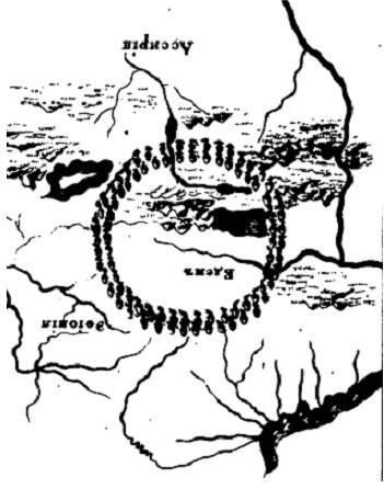 Здесь можно предположить, что в правом нижнем углу изображен Ганг с его притоками, слева находится Инд, там же, как мы установили, должна находиться Эфиопия, Чуть выше течения Ганга, присутствует фрагмент реки Брахмапутры, тогда область обведенная кружком это ― Кашмир. Севернее Кашмира находится Ассирия.