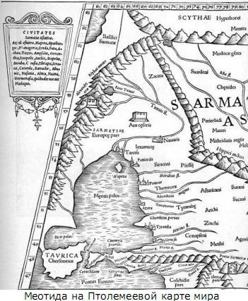 Очевидно, что на этой карте присутствуют детали, которых нет возле Азовского моря, какие-то непонятные горы на севере и на западе Меотиды, большое количество рек, которых нет в действительности. Но эти непонятные горы присутствуют в описании Меотиды древними авторами. Получается, что составители карты, на ту карту, которая у них была в распоряжении, карты очень приблизительной, нанесли исходя из описаний Меотиды, дополнительные детали. Хотя нельзя исключать, что эта карта результат компиляции европейской карты и карты, которая попала в Европу с востока, на которой была изображена эта Меотида. Поэтому можно находить на этой карте детали, которые соответствуют карте Азовского моря, но тут же видно, что Танаис в верхнем течении, похож на Инд. Но реальную картину мы не видим, поэтому ничего не остается, как только делать предположения.