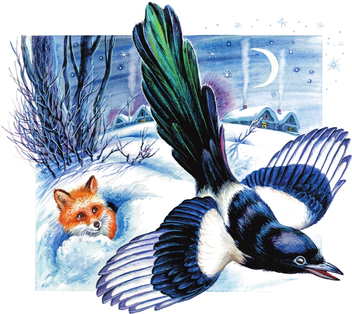 Сорока была опытная, старая и нарочно летела у самой земли, потому что от деревень и лесом всё-таки тянуло теплом и сорока не боялась замёрзнуть. Никто её не видел, только лисица в осиновом яру высунула морду из норы, повела носом, заметила, как тёмной тенью пронеслась по небу сорока, шарахнулась обратно в нору и долго сидела, почёсываясь и соображая, – куда ж это в такую страшную ночь подалась сорока?