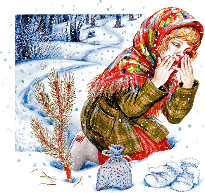 На другой день Варюша поймала Сидора, завернула в платок и понесла в лес. Из-под снега торчал только самый кончик еловой ветки. Варюша посадила на ветку Сидора и попросила: