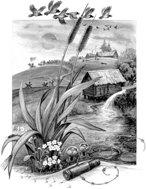 Пётр стоял вместе с бойцами на пароме. Паром плыл через широкую светлую реку. За ней садилось золотое солнце, по берегам стояли ракиты, летали над ними аисты с красными лапами.