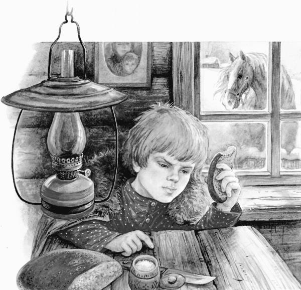 В один из таких тёплых серых дней раненый конь постучал мордой в калитку к Филькиной бабке. Бабки не было дома, а Филька сидел за столом и жевал кусок хлеба, круто посыпанный солью.