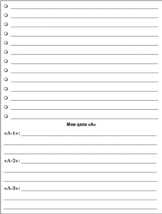 (После этого перепишите три самые важные Ваши цели – А-1, А-2, А-3 – еще раз, сформулировав их как цели SMART. Ниже для этого также выделено специальное место. – К. Б.)