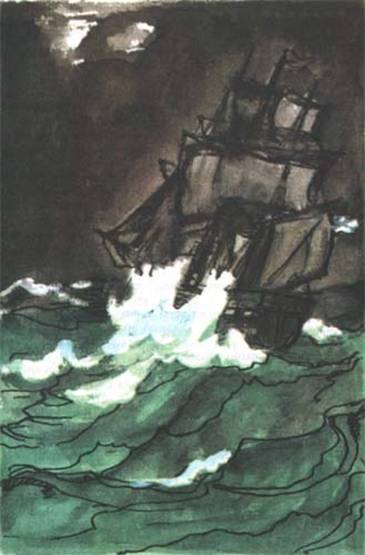 Непроглядная темень по-прежнему окутывала клипер, недвижно стоявший среди моря. На палубе царила грозная тишина. Только рокотало море да ветер жалобно посвистывал в снастях. И среди этой тишины клипер, приподнимаемый волнением, снова еще раз и другой тяжело ударился о подводный камень. Удары эти сопровождались таким наводящим ужас треском во всех членах судна, что казалось, оно не вынесет этой пытки и вот-вот сейчас развалится пополам.