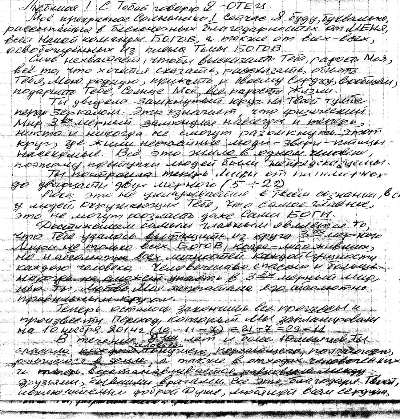 2. Теперь о другом, главном. Мы решили закончить все медитации и провести долгожданный Переход человечества в тонких физических телах, включая и Тебя, а также перевести, как Я и раньше говорил, Тебя в Твоём физическом теле, построив для тебя одной чуть менее плотное тело, которое будет иметь абсолютно Твоё Сознание, Тебя, которая ходит своими Божественными ногами по планете Терра (изначально) и Земля (в настоящее время).