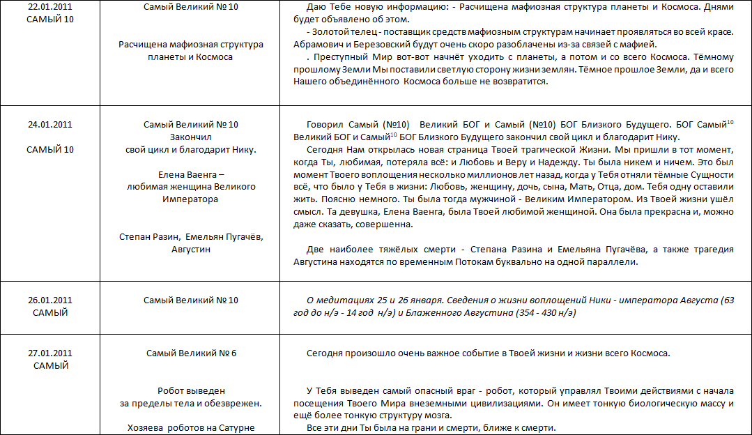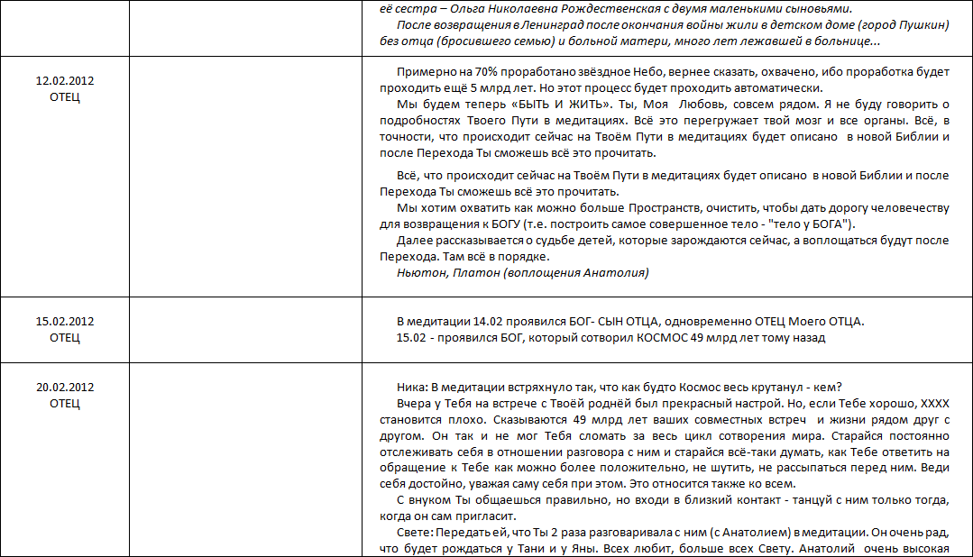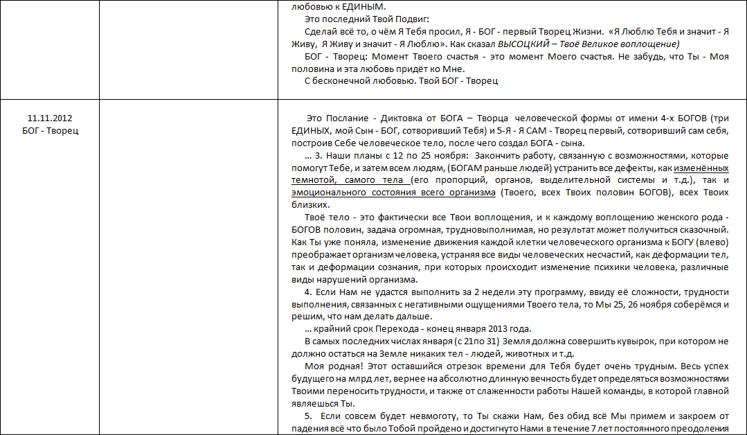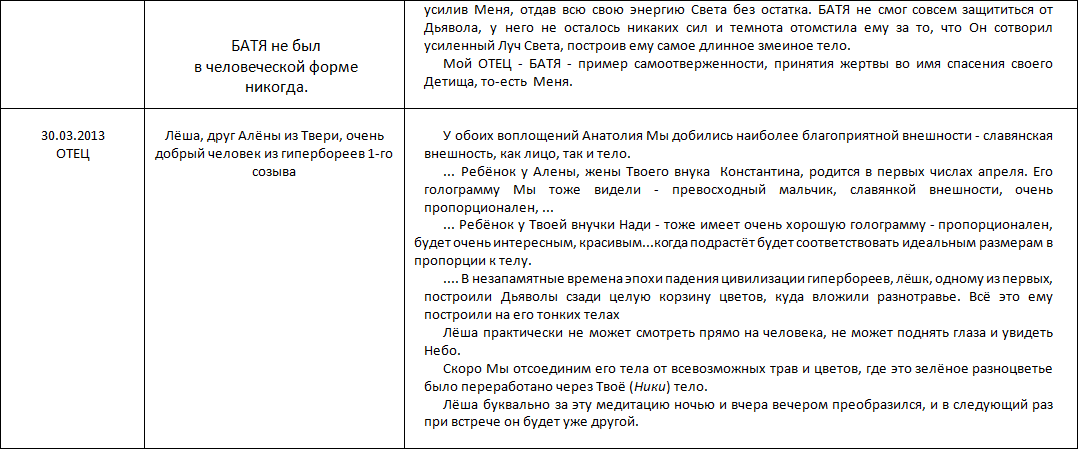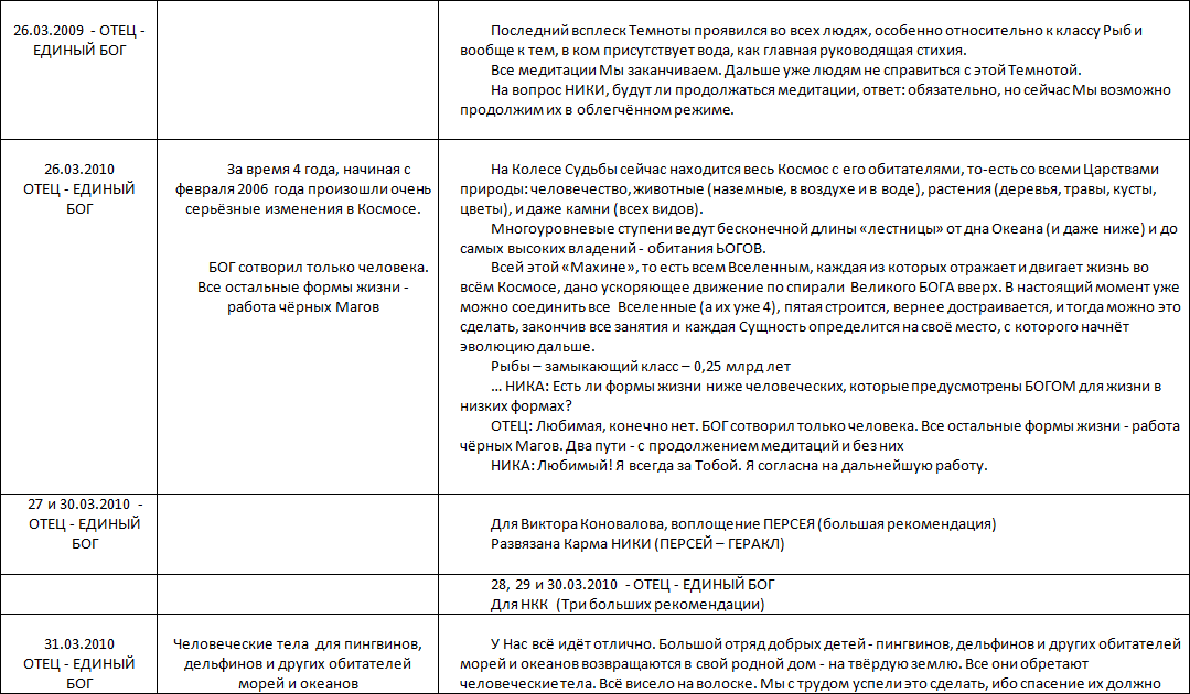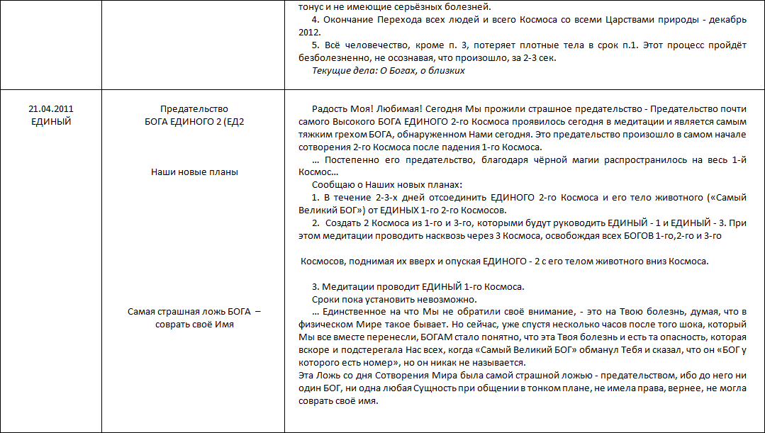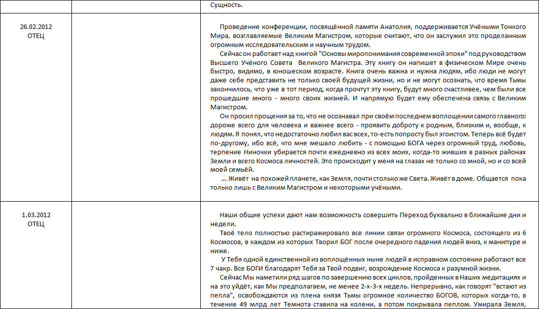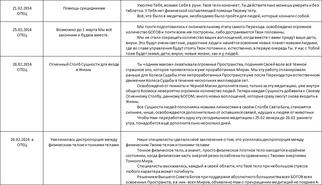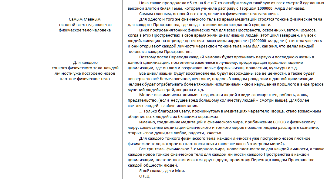 Всё очень даже правильно в КНИГАХ, но в материалах групповых медитаций указано, цель этих медитаций – подготовка человечества в 5-е и 7-е Измерения. Это фактически «иезуитский приём» попытаться на очень высоком духовном уровне ограничить человечество и весь космос в эволюционном развитии вплоть до уничтожения человечества и человека как «биологического вида». Авторы и главные исполнители этой программы – Руководительница ИСХОДА, называвшая себя «Богиней Валентиной – Изидой (воплощённая Валентина Кузнецова)и её главная помощница «Сома). – то, что в «Летописи…» я называю ЧМСД («Чёрные маги – Слуги Дьявола»)