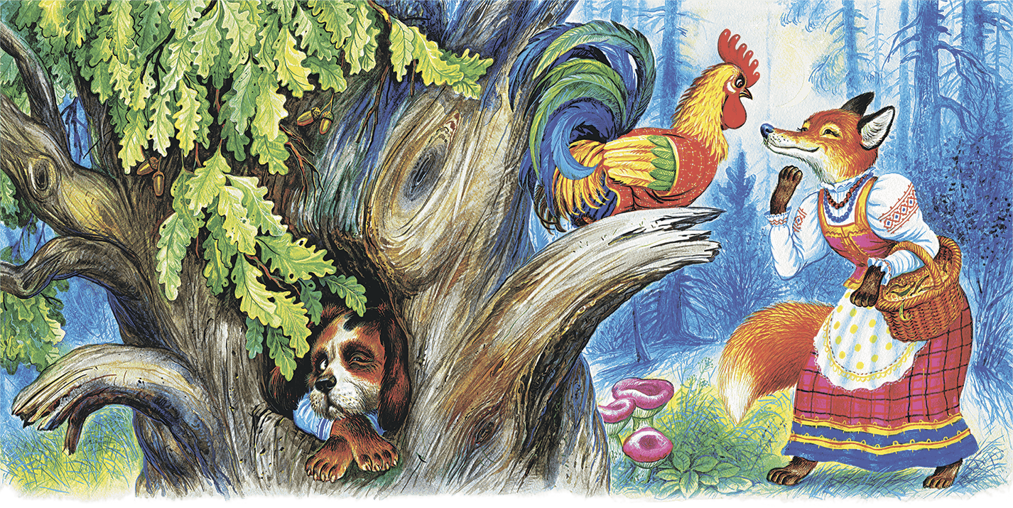Услыхала петуха лиса; захотелось ей петушьим мясом полакомиться. Вот она подошла к дереву и стала петуха расхваливать:
