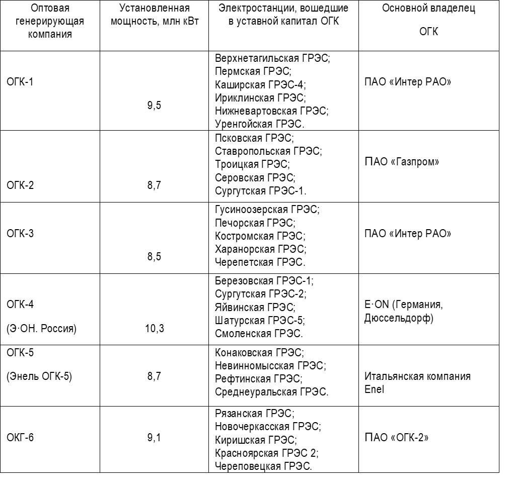 Оптовые генерирующие компании. На базе крупных тепловых электростанций создано шесть ОГК, продающих электроэнергию на оптовый рынок. ОГК сформированы по принципу экстерриториальности, т. е. их электростанции не доминируют на территории их расположения, и установленные мощности ОГК примерно равны. Данный принцип формирования обеспечивает снижение возможностей для монопольных злоупотреблений на оптовом рынке электроэнергии.