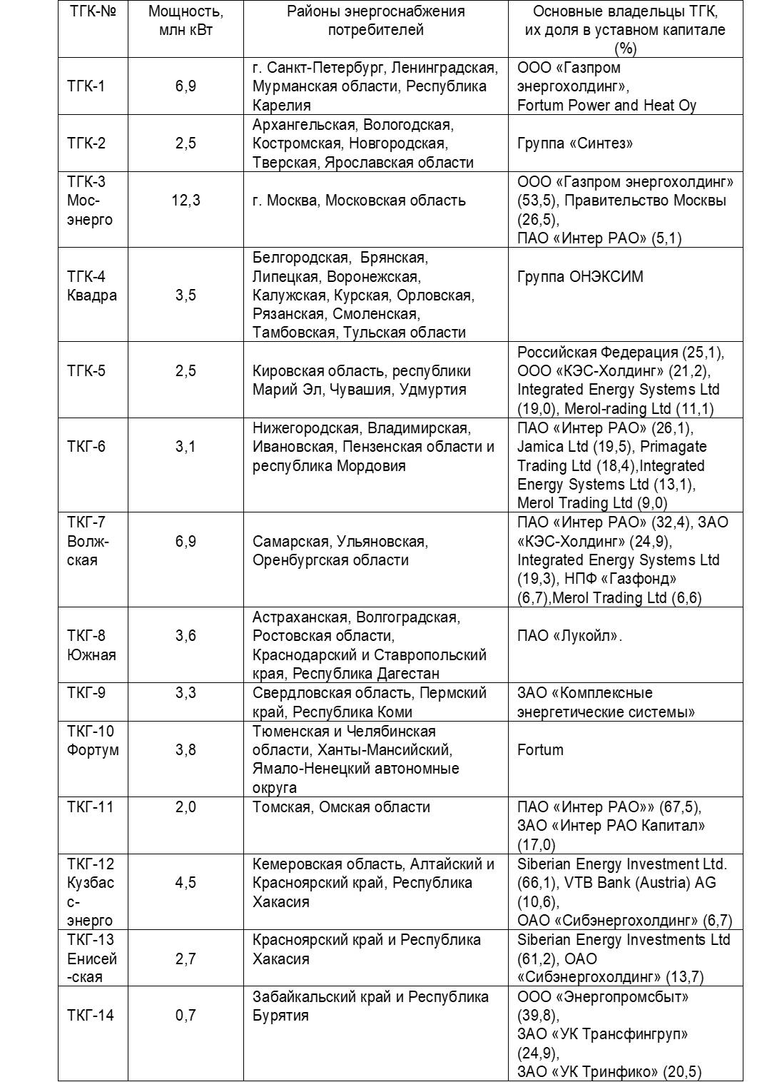 Данные об установленной мощности ОКГ, состава их электростанций и основных владельцах приведены в табл. 4.