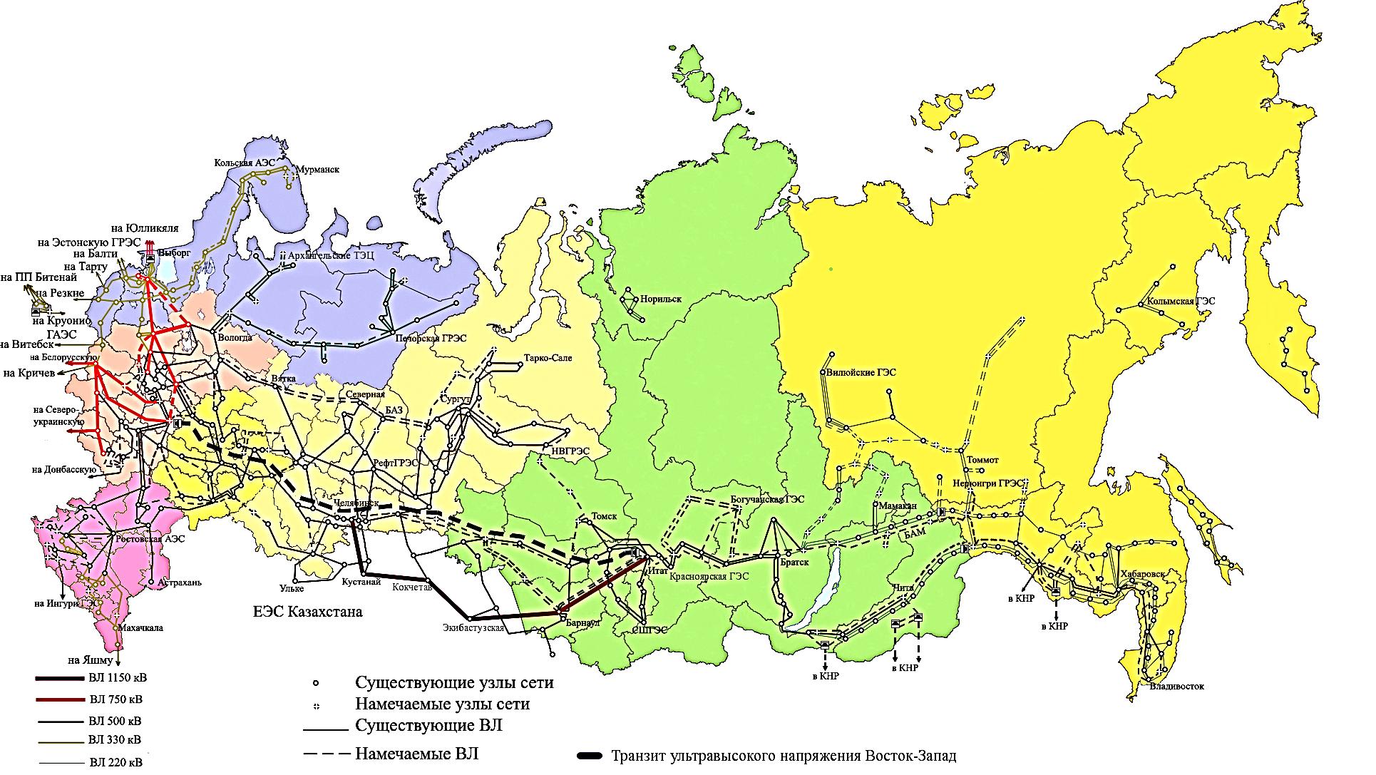 Единая энергетическая система (ЕЭС) России ― технологическая совокупность объектов электроэнергетики (электрических станций, электрических и тепловых сетей и др.), связанных единым процессом производства и передачи энергии и управляемых централизованно системным оператором. Около 90 % генерирующих мощностей России сосредоточено в ЕЭС России. Схема ЕЭС России представлена на рис. 2.