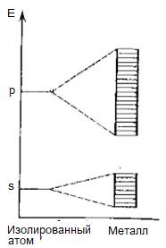 В случае перекрывания орбиталей N атомов в твердом теле, образуются N новых орбиталей, относящихся к твердому телу. Уровни энергий орбиталей в металле расположены близко и образуют энергетические полосы [10,с.138]: