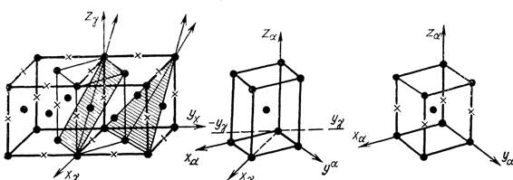 Схема перестройки решеток подробно рассмотрена в монографии Уманского [3]. Так, например, показана схема изменения конфигурации гранецентрированной решетки на объёмно-центрированную решетку то есть при γ→α превращении [3,с.244]: