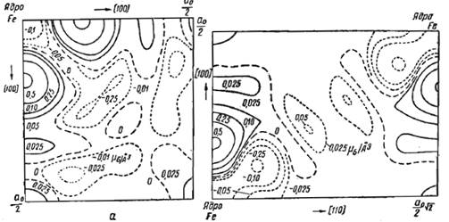 На диаграммах видна малая плотность посередине между атомами железа. На грани куба плотность избыточная, в диагональном направлении плотность недостаточная.