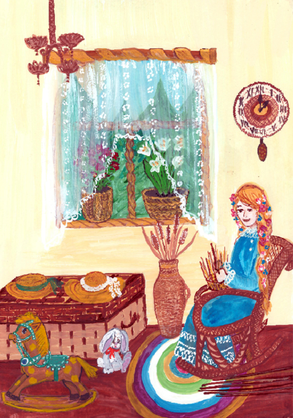 В её плетёной избушке стояла чудесная плетёная кроватка. На ней лежали плетёные матрасик, подушечка и одеяло, а рядом на полу – разноцветный плетёный половичок из козьей шерсти.