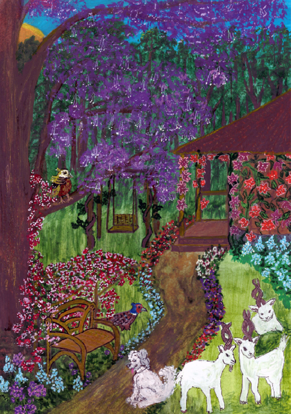 В её дворе бегали три забавные козочки с заплетёнными рожками, хвостиками и бородками. Весёлая собачка с заплетёнными ушками и длиннохвостые фазаны с заплетёнными хохолками.