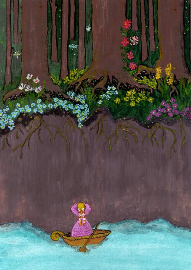 Через сад к избушке тянулась плетённая из мха, ветвей и цветов извилистая тропинка, по которой любила гулять Тётушка Плетёнушка. Плести венки и слушать пение птиц. А за садом протекала прохладная, чистая речка, по которой она любила путешествовать в своей плетёной лодочке.