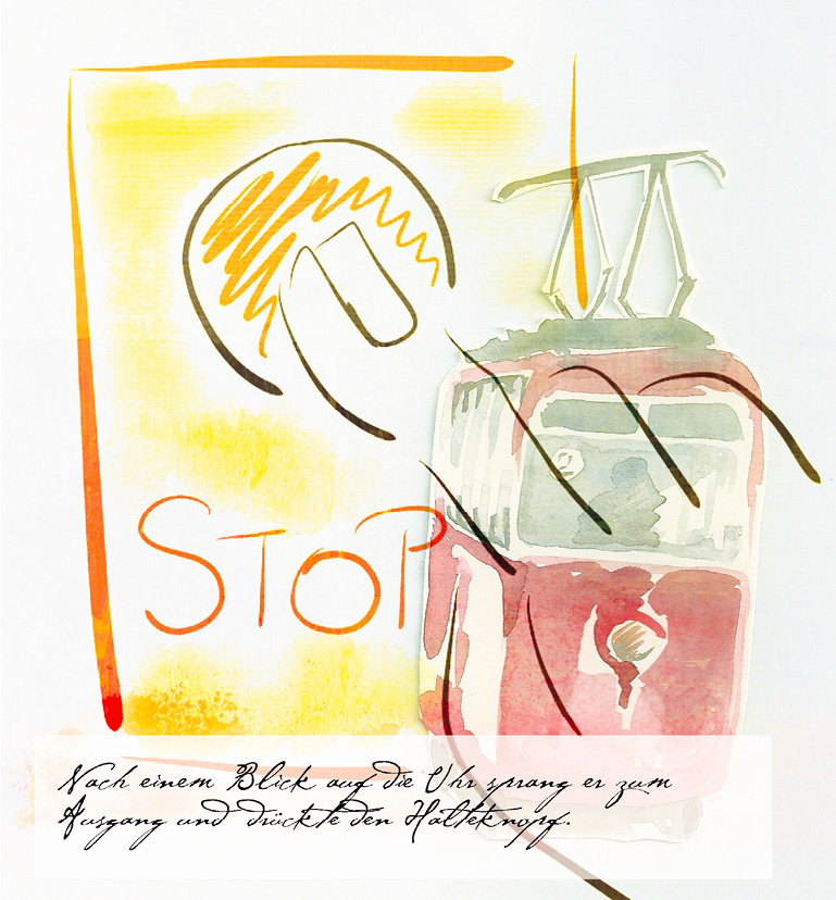 Die Straßenbahn ruckelte, er betrachtete die Hausfassaden und Portallösungen, die langsam an ihm vorüberzogen. Da er im Büro gerade an einem Portal für ein Mehrfamilienhaus arbeitete, sah er sich die verschiedenen Eingänge der Häuser noch genauer an. Sein Blick blieb an einem Fenster hängen und ohne es zu wollen, beobachtete er hinter der Scheibe eine Gruppe von Menschen, die sich um ein Aktmodell versammelt hatten. Sein Interesse galt nicht dem Modell, sondern den Schülern, die vor ihren Staffeleien standen und mit geneigten Köpfen und ausgestreckten Daumen die Proportionen maßen. Ihre Gesichter waren gleichermaßen konzentriert wie entspannt. Trotz der Distanz konnte er sehen, wie einer einen gekonnten Strich auf seine Leinwand setzte und damit seine Figur zum Leben erweckte. Rechts neben der Biedermeier-Haustüre hing ein Schild, von dem er gerade noch die ersten Zeilen entziffern konnte, bevor die Straßenbahn wieder anfuhr und die Station verließ: „Kunstkurse – Öl – Acryl – Tempera“, darunter der Satz „Come as you are“ mit einem dicken Filzstift rasch dazugefügt. Er spürte eine leichte Zerrung im Nacken, als er sich nach dem Schild umdrehte, das nun kleiner und kleiner wurde. Nach einem Blick auf die Uhr sprang er zum Ausgang und drückte den Halte-Knopf. Die vorige Station war bloß zweihundert Meter entfernt, sodass er die Strecke bis zur Haustüre in ein paar Minuten wieder zurückgelegt hatte. Außer Atem kam er vor dem Fenster, in das er vorher hinein gestarrt hatte, zu stehen. Fasziniert betrachtete er das Treiben der Kunststudenten. Plötzlich sah er sich um und schämte sich für seine Indiskretion. Aber keiner der Passanten interessierte sich für ihn. Nochmals sah er auf die Uhr und musste feststellen, dass er, wenn er sich nun beeilte, gerade noch rechtzeitig ins Büro kommen würde. Die morgendliche Karte fiel ihm ein. Ganz gegen seine Liebe zur Pünktlichkeit entschloss er sich dazu, sein Smartphone herauszukramen und die Nummer seines Büros anzuwählen. Nachdem er der Sekretärin seine Verspätung bekannt gegeben hatte, stieß er die Haustüre auf und folgte einem weiteren Schild, das den Malkurs im Mezzanin ankündigte.