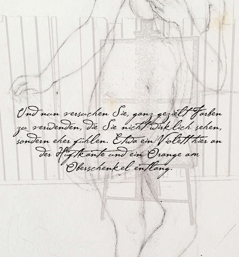 „So ist es gut“, lobte der alte Professor, „und nun versuchen Sie ganz gezielt Farben zu verwenden, die sie nicht wirklich sehen, sondern eher fühlen. Etwa ein Violett hier an der Hüftkante und ein Orange am Oberschenkel entlang. Mischen Sie sorgfältig auf der Palette, solange, bis sie das Gefühl haben, dass sie die Farbe einfach unwiderstehlich finden. Sie haben mich schon richtig verstanden: Unwiderstehlich. Das ist wichtig. Sie müssen davon ganz durchdrungen sein. Sich fast ein bisschen lächerlich dabei vorkommen, wie begeistert sie in diesem Augenblick von ihrer Farbmischung sind. Nur dann wird es auch funktionieren.“ Der Professor nahm ihm die Palette aus der Hand, drückte etwas Preußischblau aus einer Tube darauf und holte sich etwas Grün dazu. Mit raschem Pinsel zauberte er ein paar ungewöhnliche Farbfelder auf Dañiels Skizze und lachte leise: „Sehen Sie, was ich meine?“