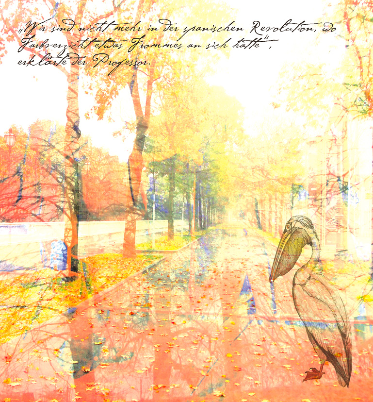 „Wir sind nicht mehr in der spanischen Inquisition, wo Farbverzicht etwas Frommes an sich hatte“, erklärte der Professor weiter und zwinkerte mit den Augen:, „schalten Sie Ihr Gehirn aus und vertrauen Sie Ihrem Gefühl, dann kommt alles in Ordnung. Und legen Sie das Titanweiß aus der Hand. Jede Farbe wird damit milchig und unbrauchbar, heben Sie sich das auf – für ein paar Lichtreflexe am Schluss. Für das Mischen nehmen Sie am besten Zinkweiß, das ist verträglicher!“