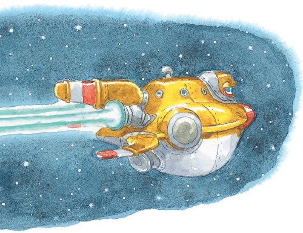 Дети лежали на своих сидениях позади дяди Альберта. Из-за стремительного ускорения ребят буквально вдавило в кресла. Руки стали тяжёлыми, как свинец – невозможно поднять. Даже дяде Альберту пришлось попыхтеть, управляя ракетой. Наконец, он потянул какой-то синий рычаг, и давление уменьшилось.