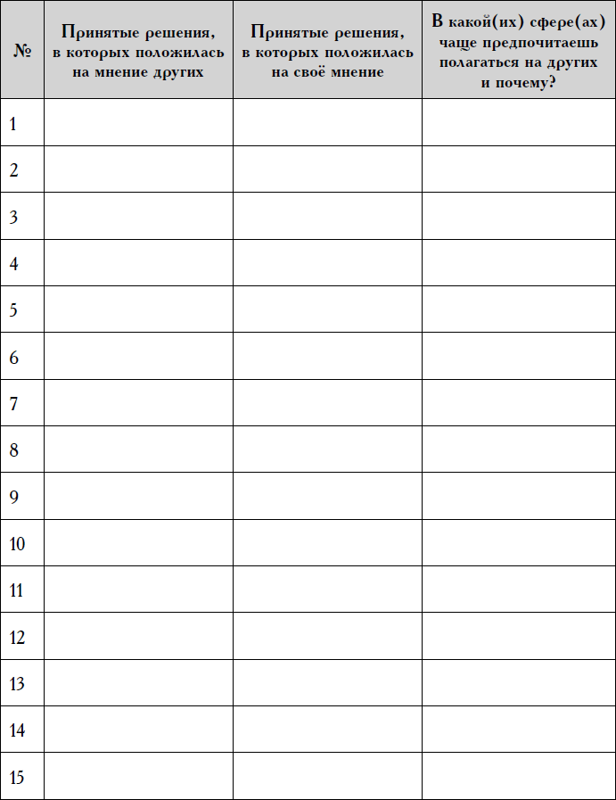 Напиши в первой колонке ситуации, где ты приняла решение, положившись на чужие мнения. Во второй, напротив, решила по-своему. Проанализируй: к каким результатам это приводило? Ты ими довольна? Каких решений большинство? Исключи ситуации, где ты опиралась на советы наставника, профильного эксперта, лидеров мнения. Часто на наше мнение оказывают влияние не ЭКСПЕРТЫ, а простые обыватели или те, кто довлеет над нами. Выпиши не менее 5 примеров, если не знаешь, с чего начать, то возьми на рассмотрение сферу жизни, которая в настоящий момент вызывает наибольшую неудовлетворённость.