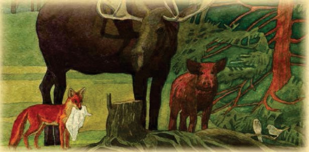 Воробей, вспорхнув, полетел в лес звать лесных жителей на уборку. Прошло совсем мало времени, когда на полянку, где дожидалась печальная Медвежонка, вышли кабан, зайцы, белки, слетелось множество птиц и самым последним из чащи показался большой рогатый Лось.