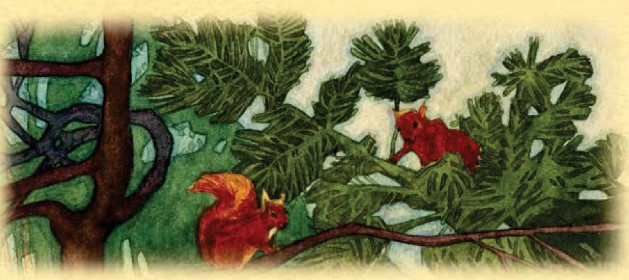 – Отдай, это Медвежонка нашла! – загалдели внизу зайцы, а белки, выпрыгнув на берег, взобрались на ель к своей подруже и принялись дразниться: