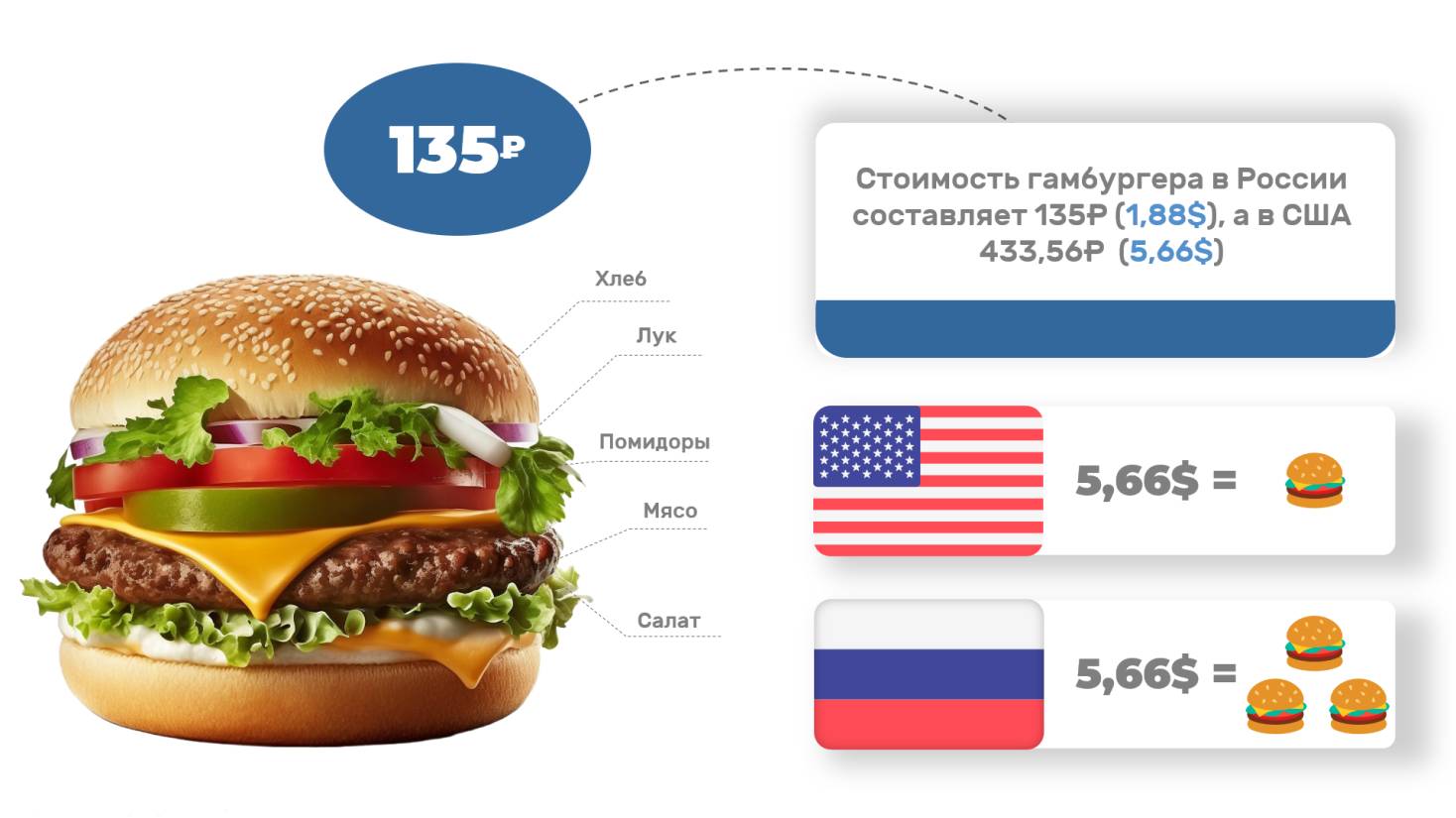 Рис. 2.4. Стоимость гамбургера в США и России (март 2023 г.)