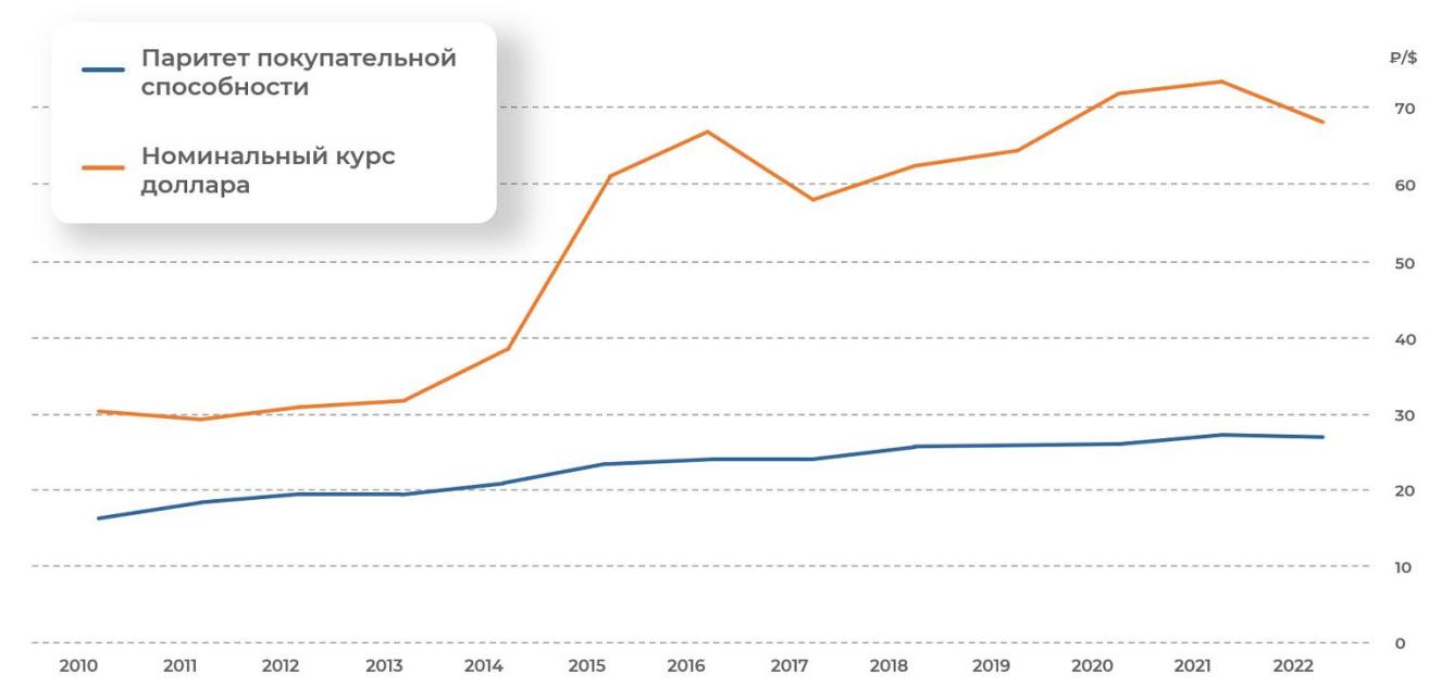 На графике показан паритет покупательной способности российских рублей за 1 доллар США с 2010 года.
