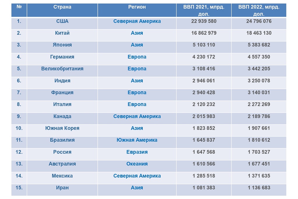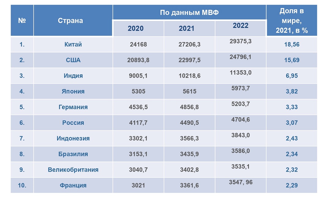 В таб. 2 показан номинальный ВВП стран за 2021–2022 годы. В списке лидируют США, за ними следует Китай, Россия находится на 12‑м месте.