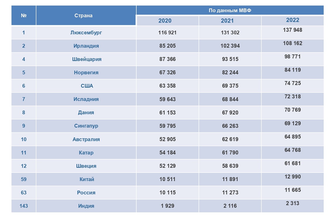 Поэтому Китай по ВВП на душу населения занимает в рейтинге лишь 59‑е место, Индия – 143‑е, Россия – 63‑е, а США – 6‑ое. Лидер по данному показателю – Люксембург, где на одного гражданина приходится почти 138 тыс. $. В переводе на рубли это примерно 10 млн 350 тыс. руб. в год (для сравнения, ВВП на душу населения на одного россиянина составляет 875 тыс. руб. в год). За Люксембургом следуют Сингапур, Ирландия, Швейцария, Норвегия и другие страны, которые не попали даже в первую двадцатку по показателям номинального ВВП и ВВП по ППС. При этом нужно понимать, что ВВП на душу населения – это усреднённое значение. Оно не отражает неравенство в доходах людей внутри страны.