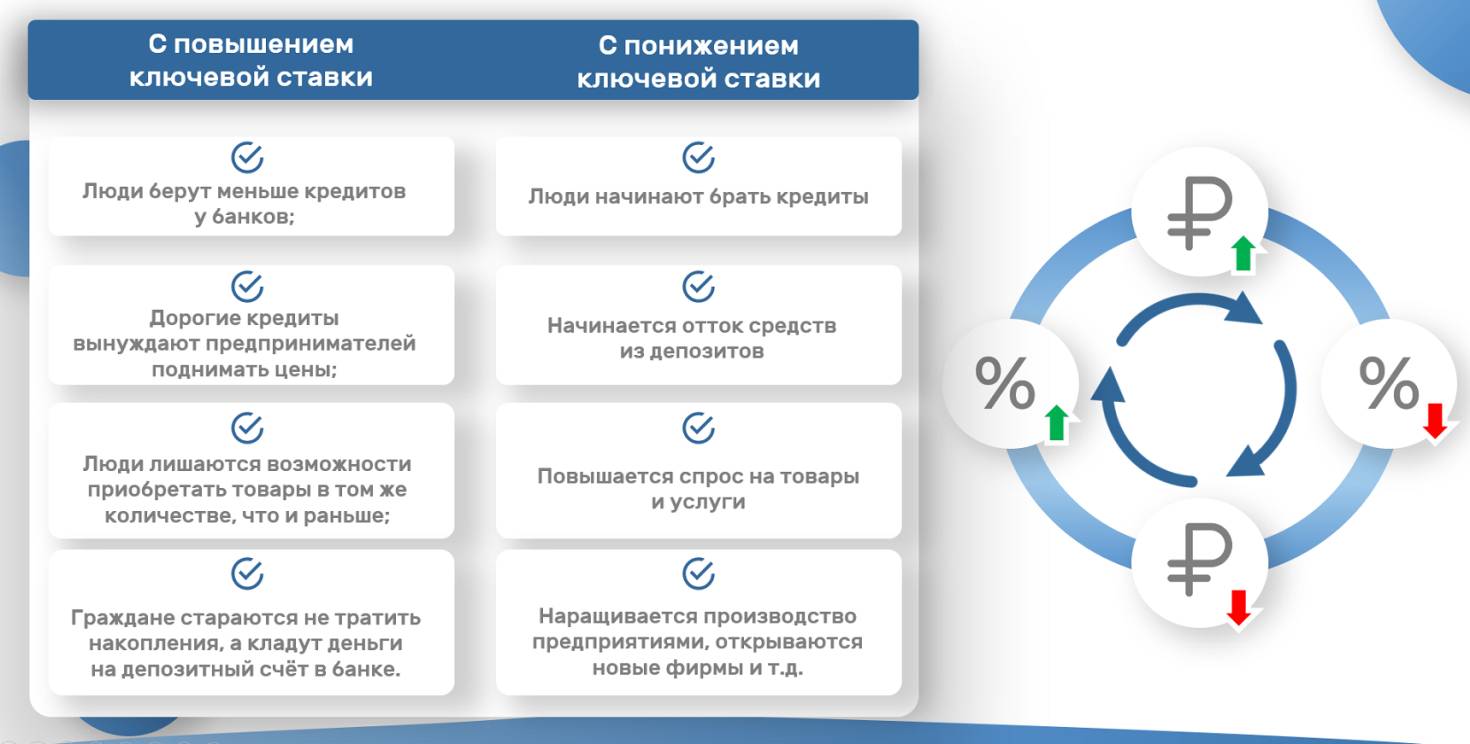 Чтобы снизить темп инфляции ключевую ставку повышают. В результате: