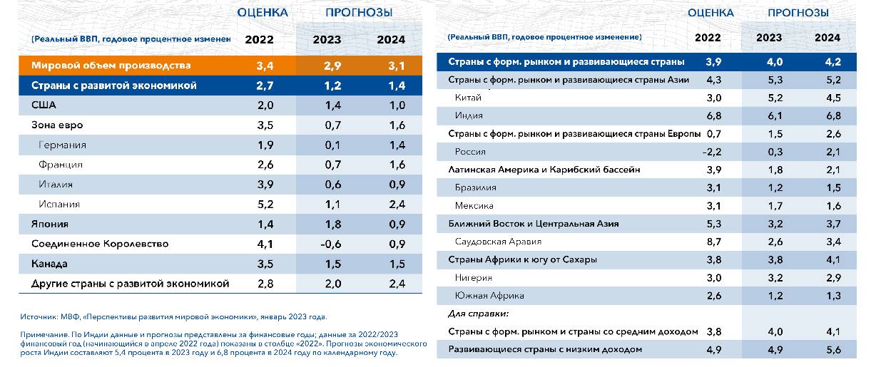 Потенциальный ВВП – это возможный внутренний валовой продукт в условиях полной занятости населения при использовании всего имеющегося ресурсного потенциала страны. Его рассчитывают для определения показателей, которых может достичь страна при рациональном использовании ресурсов, грамотном планировании и обеспечении занятостью всех трудоспособных граждан на фоне естественного уровня безработицы. На его основе и с учетом других экономических и геополитических факторов строят прогнозы роста экономики. С докладом о перспективах развития мировой экономики 2 раза в год выходят МВФ и Всемирный банк. Далее представлены прогнозы от ведущих мировых организаций на 2023–2024 годы.