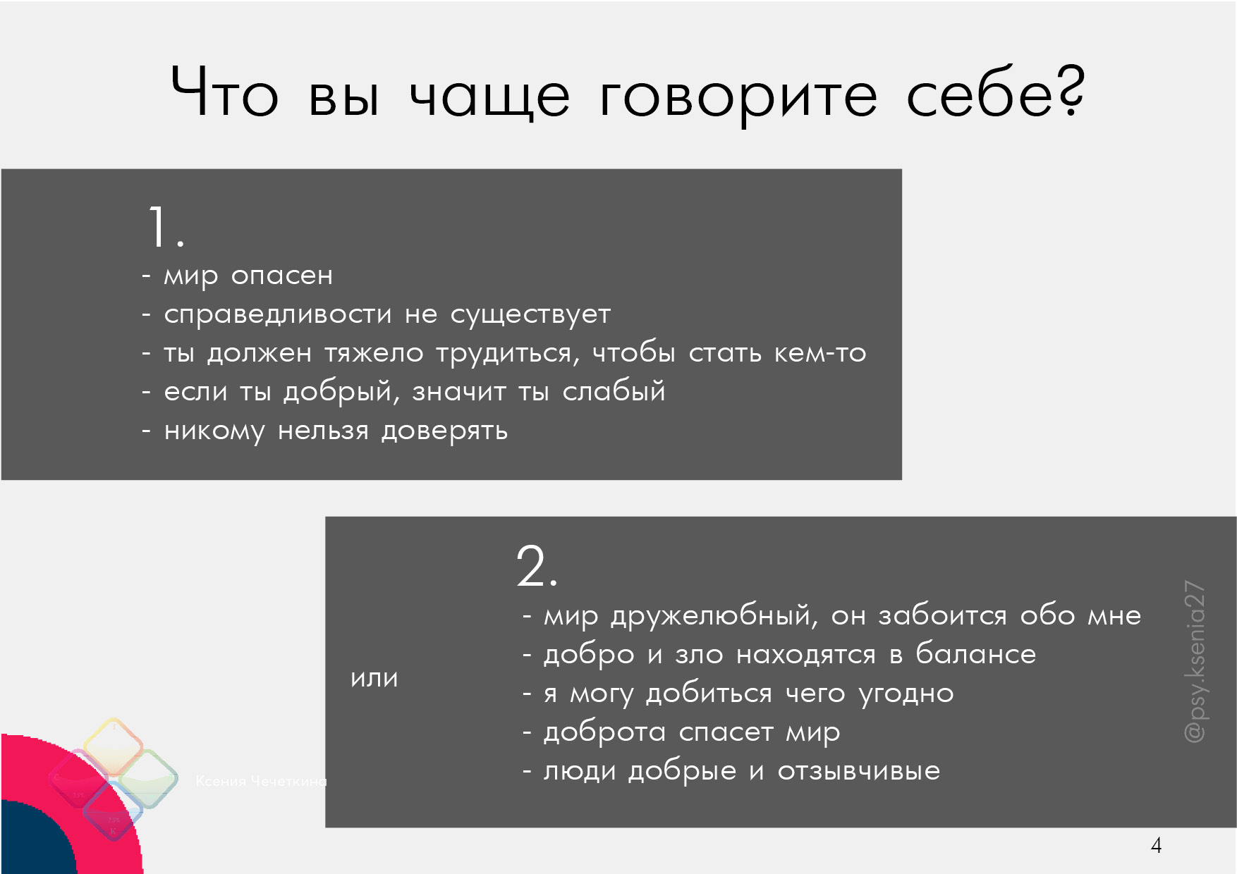 Давайте попробуем поискать какие истины, или концепции, они же убеждения, есть у вас? Какую они играют роль в вашей жизни и помогают ли справляться с ней, или же наоборот, только мешают и вносят сумятицу?!