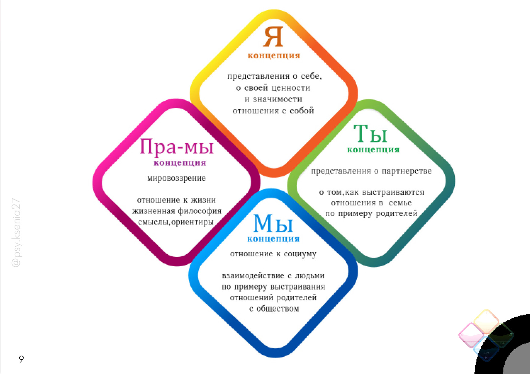 Более наглядно эти сферы представлены в виде ромба, который в Транскультуральной Позитивной Психотерапии выглядит так: