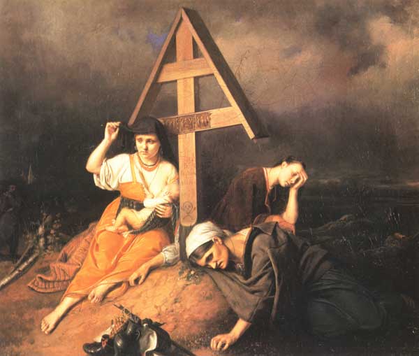 Академия удостоила Перова большой серебряной медали. Нужно было теперь заработать малую золотую. Для этой цели Перов взял сюжетом «сцену на могиле» на слова песни: «Мать плачет, как река льется; сестра плачет, как ручей течет; жена плачет, как роса падет – взойдет солнышко, росу высушит». Изображение разной степени горя этих женщин занимала Перова; идея использовать подобную тему для картины была и новой, и чрезвычайно трогательной. Сочинив эскиз, он принялся за работу. Посредине комнаты было сооружено из всевозможного домашнего хлама возвышение, вроде надгробной насыпи. Натурщиками служили ему старуха, мать Егора Яковлевича, горничная и кухарка. Всю осень и часть зимы 1858 года Перов проработал над этой картиной; но, несмотря на похвалы всех видевших ее, остался недоволен и поэтому не послал ее в Академию; почему-то ему показалось, что он еще слаб в рисунке. Это предположение заставило его снова вернуться в гипсовые классы училища и наравне с прочими учениками штудировать всевозможных аполлонов, венер и психей. Конечно, это не могло продолжаться долго: человек, вкусивший всю прелесть творчества и самостоятельного труда, должен был соскучиться на простой механической работе, и притом Перов вовсе не был так слаб в рисунке. Если ему чего и недоставало в то время, так это большей сочности письма и красок, чем он, впрочем, страдал почти целую жизнь, избавясь от этого недостатка только в конце своей деятельности.