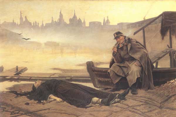 Еще более захватывающее впечатление производит «Утопленница». Серое утро только что наступило, и туман, еще не успевший подняться, заволакивает весь задний план. На берегу лежит вынутый из воды труп молодой женщины… Примостившись у вытянутой на берег лодки, сидит городовой и с полным безучастием, покуривая свою носогрейку, смотрит на труп… В этой скромной, маленькой картинке заключается и жгучая сатира на наши общественные нравы и взаимные отношения, и вопрос, над разрешением которого билось и продолжает биться немало философов. Многое можно передумать и понять, смотря на нее… В ней Перов поднялся почти до высоты философского разрешения жизненных вопросов, и, обладай живопись более могучими средствами, чем краски и кисти, эта картинка, быть может, произвела бы не меньшее впечатление, чем целый ряд проповедей о любви и сострадании к ближнему.