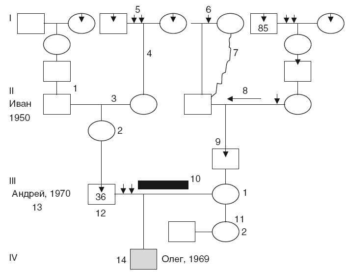 13 – рядом с квадратом, кругом – дополнительная информация (имя человека, который представлен этим кругом или квадратом, год рождения, какие-то характерные черты, болезни);