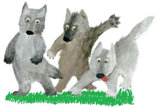 Тем же утром Затейник предложил своим братьям – Умнику и Хитруше, поиграть в пятнашки. В веселой беготне друг за другом, волчата выскакивают на берег лесного озера. А здесь! Здесь перед ними открывается потрясающая картина! Два рыбака сосредоточенно следят за поплавками, а рядом с каждым из них стоит ведро, наполненное до верха трепещущейся рыбой! Затейник и Хитруша переглядываются и, мгновенно поняв друг друга, стрелой бросаются к ведрам с намерением ухватить, хотя б по паре рыбешек. Но не тут-то было! Оба рыболова, словно почуяв готовящийся разбой, оглядываются. Понимая, что здоровенные дяденьки сейчас же кинутся отбирать свое добро, а им, воришкам, явно не поздоровится, Затейник и Хитруша с оскорбительными криками «жадины-говядины!» пускаются наутек в чащу. За ними следует и Умник. Через минуту все трое уже в безопасном месте – на своей любимой поляне. Они дружно валятся на траву, тяжело дыша и не в состоянии вымолвить ни словечка. О поляне нужно сказать, что она раскинулась на лесной опушке, по краю которой, выбежав из леса, вьется тропинка. А ведет тропинка к домику Красной Шапочки. Домик – прехорошенький, окружен с трех сторон кустами махровой сирени и хорошо виден с поляны. К моменту, когда мама Красной Шапочки начинает вынимать из духовки пышущие пирожки, волчата, уже отдышавшись, могут говорить. Первым молчание нарушает Затейник.