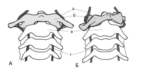 Рис. 1. Положение атланта в норме и при родовой травме. А – нормальное положение атланта. Б – смещение (поворот) атланта влево вследствие родовой травмы; а, г – позвоночные артерии; б – атлант; в – второй шейный позвонок.