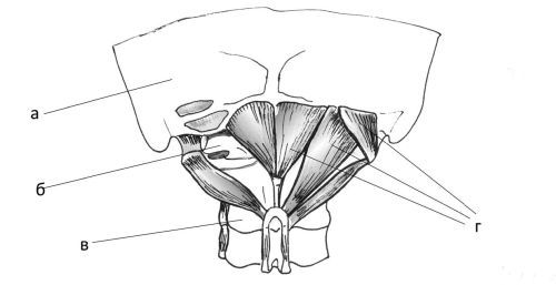 Рис. 2. Глубокие мышцы, соединяющие череп с атлантом и вторым шейным позвонком, которые удерживают атлант в неправильном положении: а – затылочная кость; б – атлант; в – второй шейный позвонок; г – третий шейный позвонок; д – мышцы, фиксирующие атлант к затылку и второму позвонку.