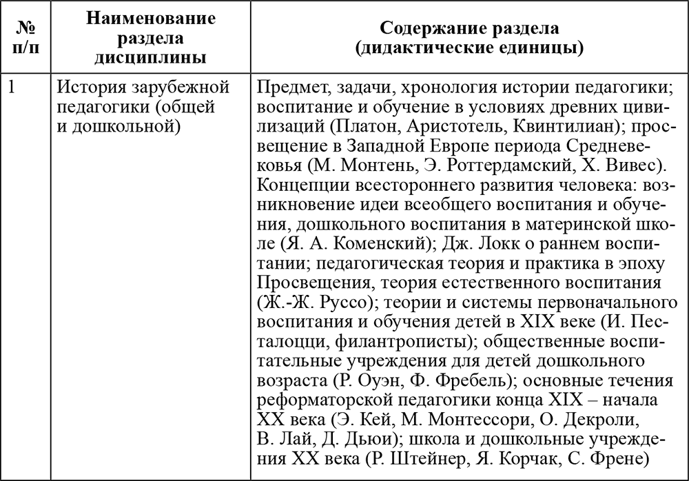 Дисциплина строится по хронологическому принципу и разделяется на две части: 1) история зарубежной педагогики; 2) история педагогики в России.