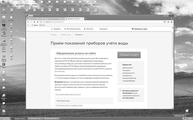 Справа жмите на синюю панель «Получить услугу», после чего вы попадете на «Основные документы». Наверху увидите предупреждение: «Рекомендуем вносить данные о потреблении воды за текущий месяц в период с 15 числа текущего месяца по 3 число следующего месяца включительно. Данные о потреблении воды, внесенные вне рекомендуемого периода, не будут учтены при расчете начислений текущего периода. В этом случае показания будут приняты к учету в следующем расчетном периоде» (это для Москвы, в других городах может быть по-другому). Заполните графу «код плательщика» и поставьте свой «номер квартиры» (рис. 29):