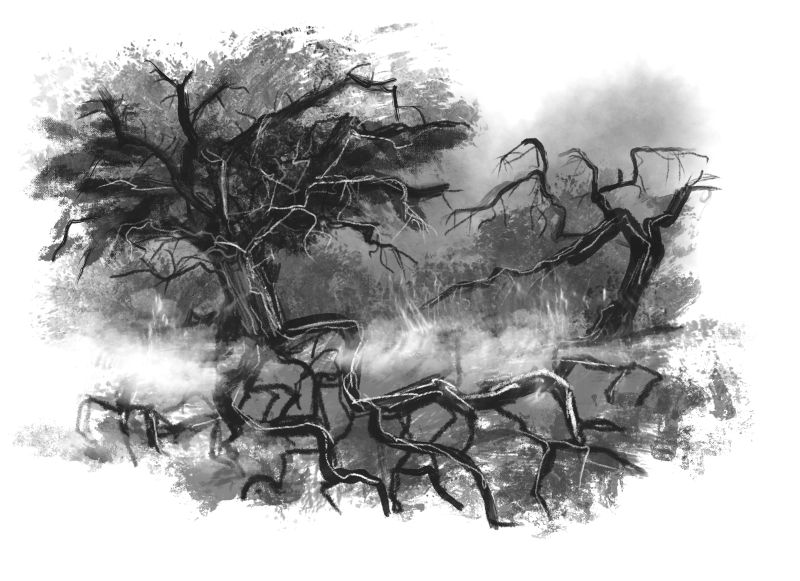 Они прибавили шаг, хотелось скорее вырваться из этого места. Корни деревьев выступали из почвы, переплетаясь между собой, как огромная грибница. Перед глазами Ника вставали кровавые куски, отлетавшие от дерева, и к горлу подступала тошнота. Друзья позволяли лишь краткие минуты отдыха, чтобы отдышаться и проверить направление. Во второй половине дня появился просвет: Ник к тому моменту мечтал о глотке чистой воды, но искать источник в подобном лесу – увольте! Он поднажал и внезапно споткнулся о корень, удержался и вновь увидел человека в дереве – тот погрузился не целиком.