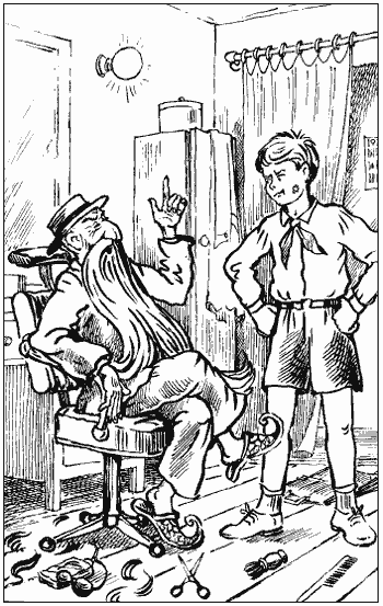 Парикмахер, глупо хихикая, приступил к делу. Но было уже поздно, потому что все присутствующие в парикмахерской заметили необыкновенного клиента. Мастера бросили свою работу и с бритвами и ножницами в руках устремились к креслу, на котором сидел несчастный Волька. Клиенты с намыленными щеками, с наполовину побритыми затылками, фыркая и подталкивая друг друга локтями, бесцеремонно обменивались мнениями насчет Волькиной физиономии. Со своей стороны и мастер, польщенный всеобщим вниманием, не нашел ничего умнее, как отпускать грубые шуточки по поводу необычайного уродства мальчика.