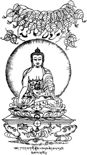 Гуру Шакьямуни, в окружении Ваджрадхары, бесчисленных будд, бодхисаттв и архатов, даков и дакинь, множества тантрических божеств, защитников Дхармы и святых гуру коренной и косвенной традиций, посылает мне и всем живым существам, которых я представляю вокруг себя, бесчисленные лучи света.