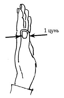 Чтобы отмерить 1 цунь от сгиба запястья, надо приложить большой палец (см. рис. 1). Причем мужчина должен приложить левый палец, а женщина – любой (если, конечно, ее ремесло не предполагает уплощение пальца, как у пряхи, например).